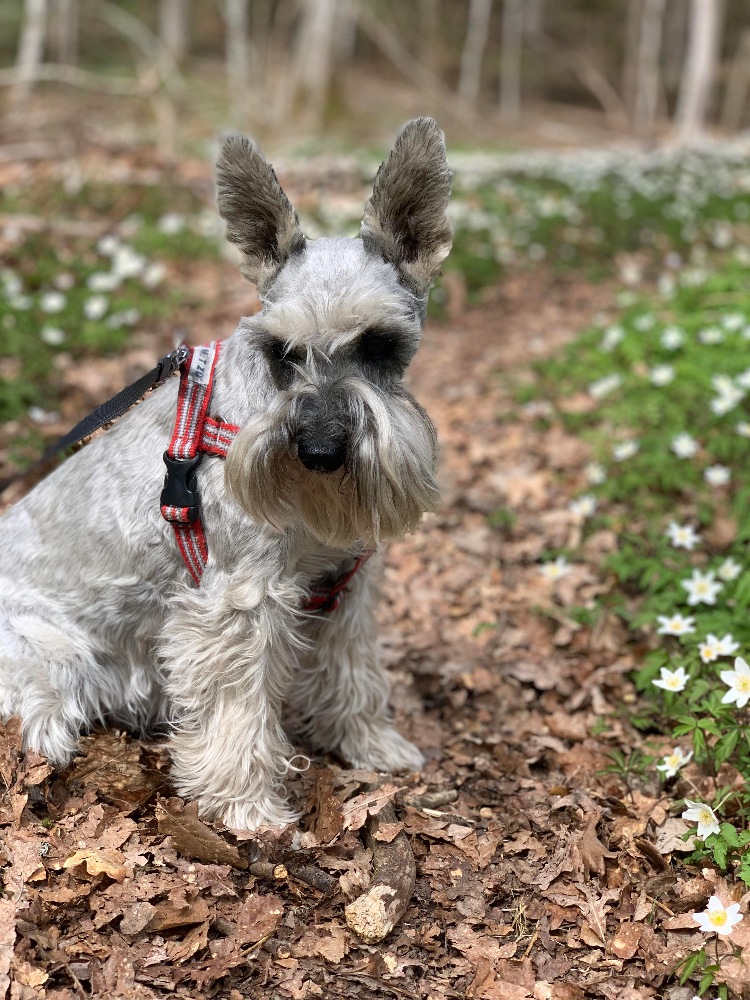 One of the dogs Hanna is dog-sitting. His name is Casper and he is a Miniature Schnauzer. In the photo some white Windflowers could also be seen, which bloom during spring in Sweden.
