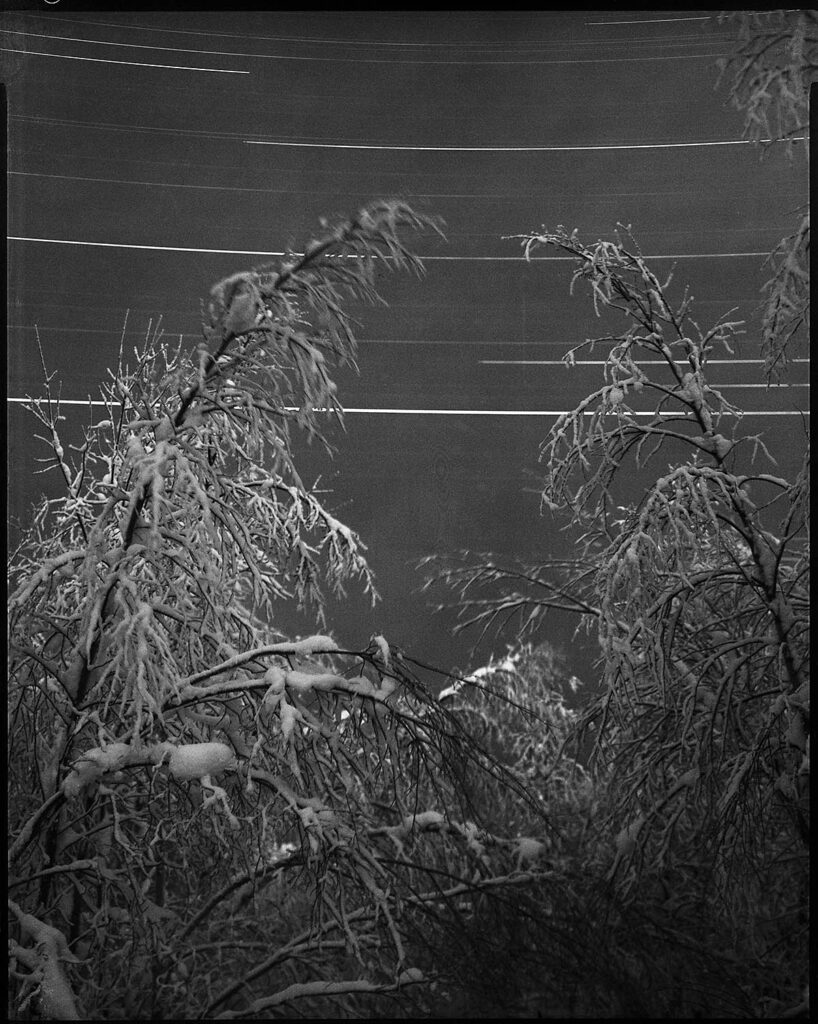 8 hours exposure star trails over frosty birch trees large format camera